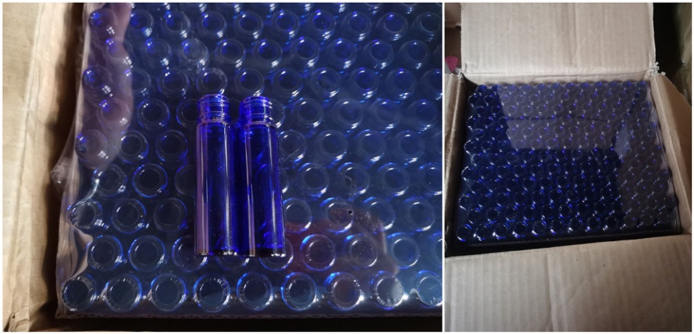 Botellas de vidrio azul cobalto de 10 ml con tapa negra.