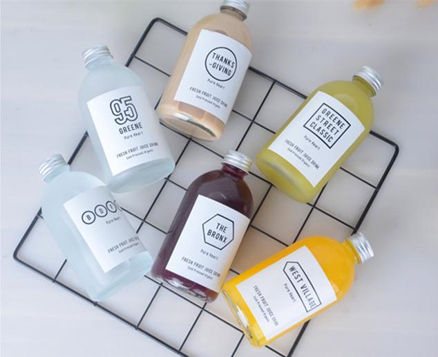 Botella de bebida de vidrio sellada para jugo frío de estilo nórdico con tapa de aluminio para botella de café, botella de vino de frutas, botella de té con leche fría.